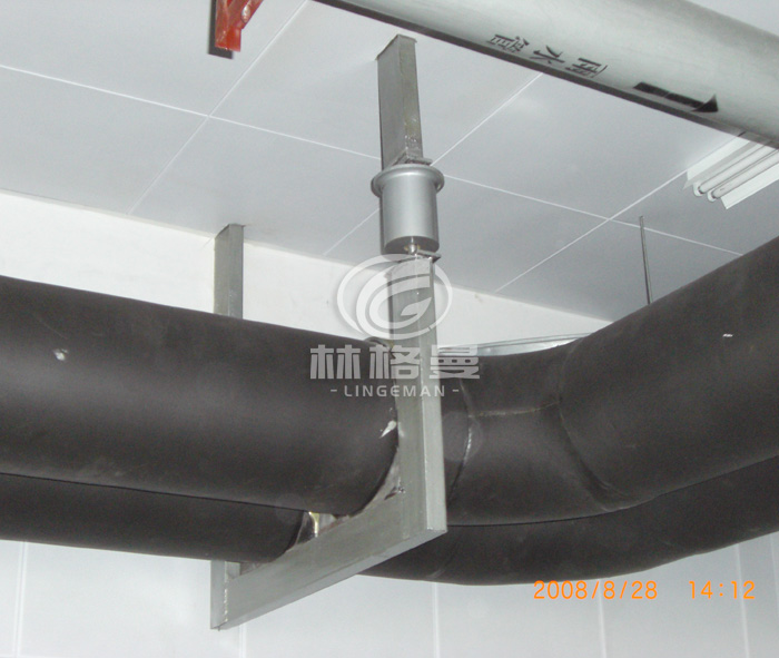 這樣可使空調(diào)主機(jī)運(yùn)行時(shí)振動(dòng)源在最近距離內(nèi)給予減弱,降低傳給冷凍主管的振動(dòng),彎頭至空調(diào)主機(jī)段主管安裝彈簧減振器支承。